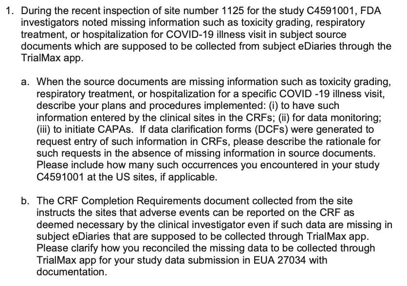 In dem Memo werden Bedenken hinsichtlich fehlender Daten in den Quelldokumenten der Probanden geäußert, die über die eDiaries der Probanden mit Hilfe der TrialMax-App (die für die Erfassung von Probandendaten in Echtzeit konzipiert ist) hätten erfasst werden sollen.
