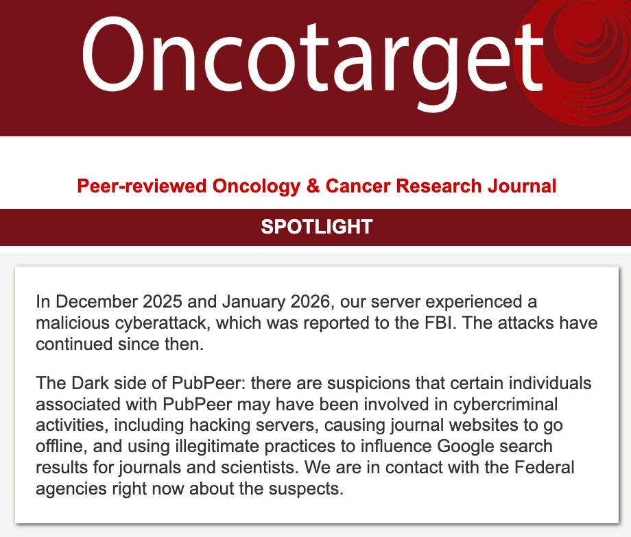 Quelques jours à peine après sa publication, Oncotarget a été victime d’une cyberattaque sophistiquée qui a mis l’ensemble du site hors ligne, censurant de fait l’article. Le journal a signalé l’incident au FBI, le qualifiant de « cyberattaque malveillante ». Les attaques ont perturbé les publications en ligne et l’accès au site web, le journal alléguant l’implication possible d’individus liés à PubPeer (le réseau dit « PubSmear ») dans le piratage, les perturbations hors ligne et la manipulation des résultats de recherche.
