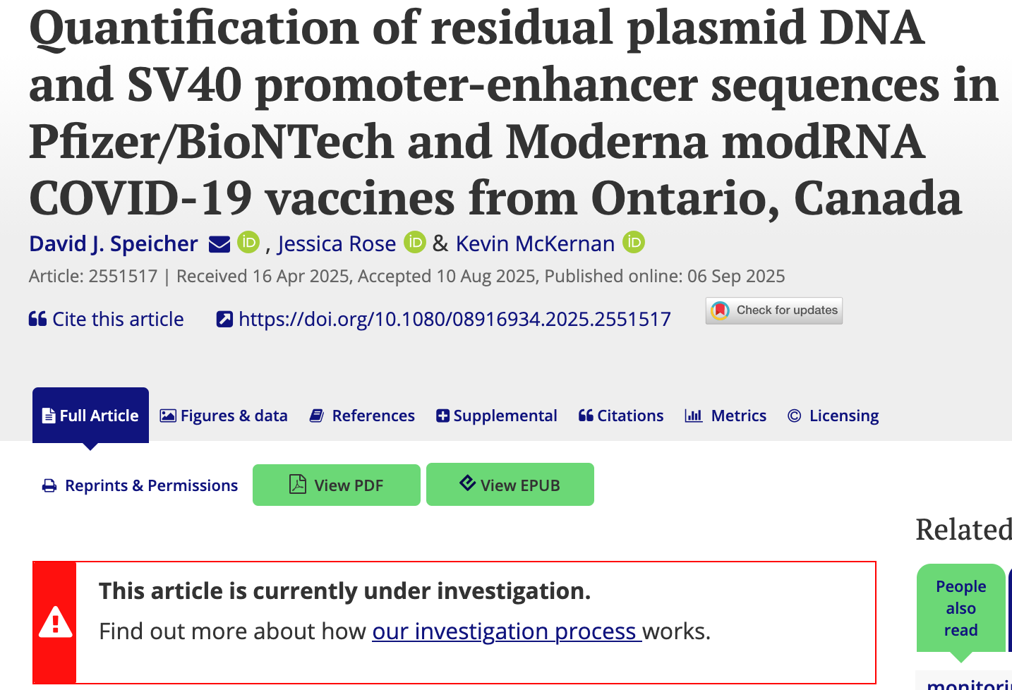 L’article, intitulé « Quantification of Residual Plasmid DNA in SV40 Promoter Enhancer Sequences in Pfizer-BioNTech and Moderna Mod RNA COVID-19 Vaccines from Ontario, Canada », a été publié le 6 septembre 2025 dans la revue Autoimmunity, une revue soumise à des pairs.