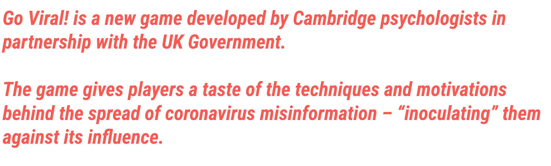 Lancé en octobre 2020, Go Viral ! a pour principal objectif de permettre aux joueurs de devenir « viraux » en diffusant la désinformation sur la COVID-19. Les deux jeux ont été développés par le Social Decision-Making Lab de l’Université de Cambridge, DROG (une organisation à but non lucratif basée aux Pays-Bas et dédiée à la lutte contre la désinformation) et l’agence de design Gusmanson.