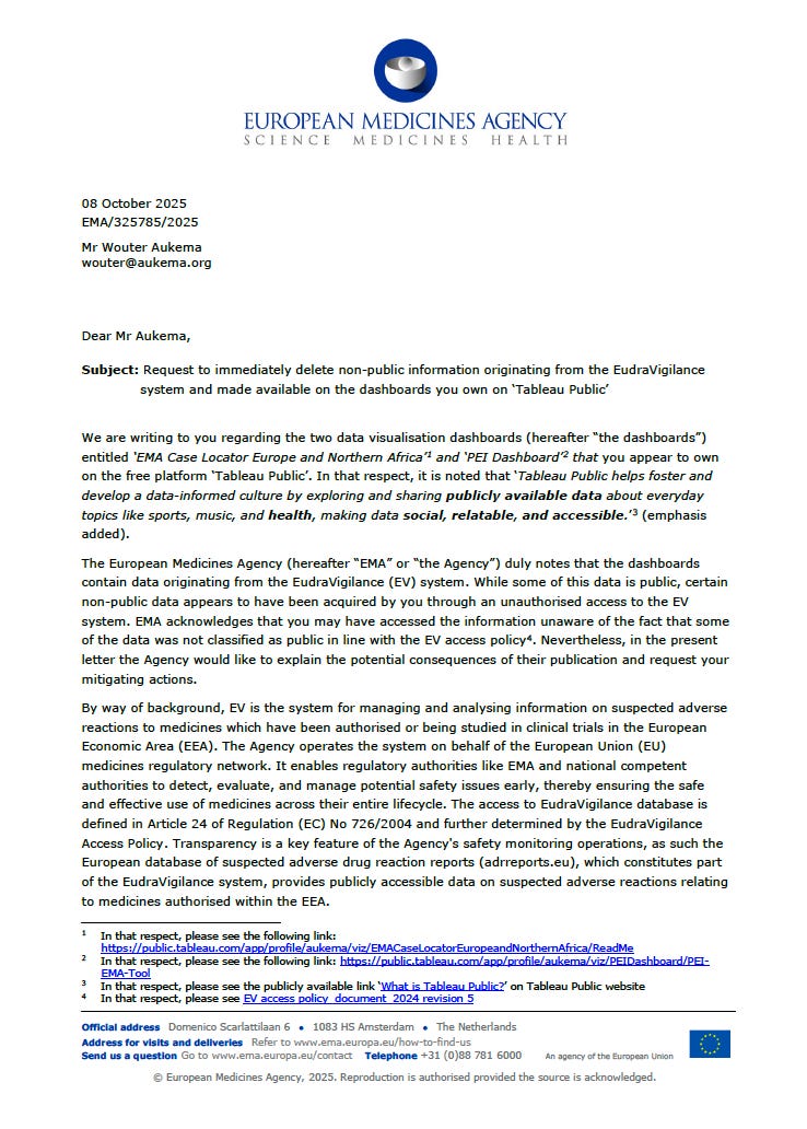 Les tableaux de bord innovants d’Aukema, conçus pour rendre les données publiques de pharmacovigilance accessibles et navigables, ont permis aux patients, aux médecins et aux chercheurs de découvrir des informations cruciales sur les effets indésirables liés aux médicaments, y compris les vaccins COVID. Cependant, quelques jours avant la présentation prévue, M. Aukema a reçu un courrier électronique de l’EMA lui demandant de supprimer ses tableaux de bord et toutes les données associées, ce qu’il décrit comme une pression juridique ressemblant à de la censure.